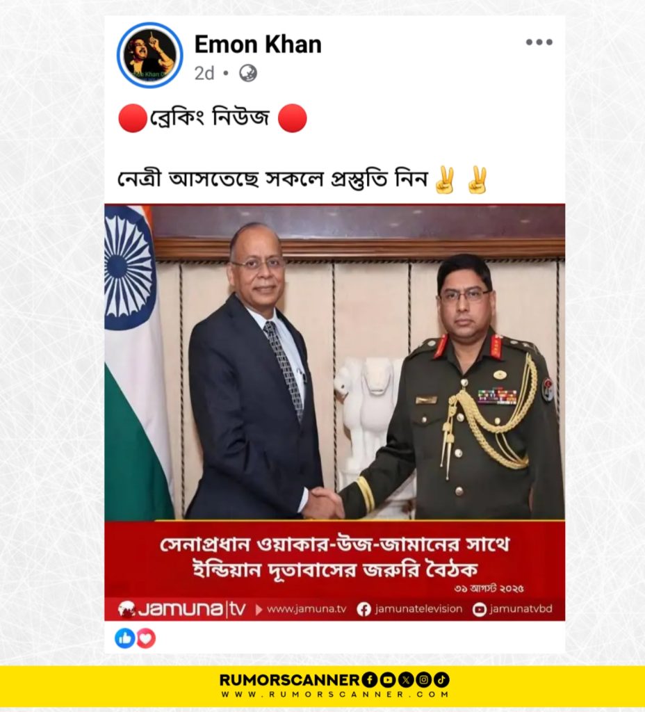 Recently, a photocard carrying the logo of mainstream media Jamuna TV, titled “Emergency meeting of Army Chief Waker-uz-Zaman with Indian Embassy”, has been circulated on social media.