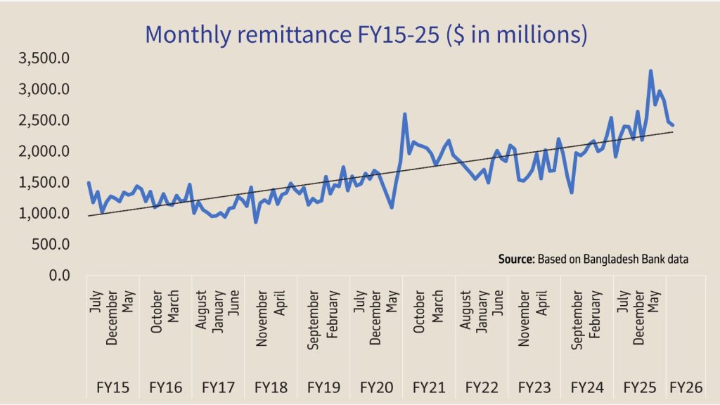 Over the past decade, monthly remittances have evolved from a steady stream into a dependable economic lifeline. Pre-FY21 flows showed incremental growth with seasonal peaks during Eid and in December. The trendline is not only upward but accelerating, reflecting Bangladesh’s deepening involvement in the international low-skilled labour market and the increasing steadiness of remittance income for families. Although monthly amounts continue to fluctuate with seasonal events, as the chart shows, both the baseline and peaks of remittance inflows have risen.