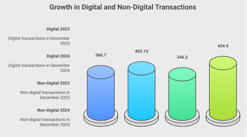Digital transaction volume rose from 366.7 million in December 2023 to 403.13 million in December 2024. Total value increased to Tk 763.4 billion from Tk 751.4 billion.