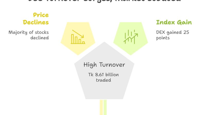 Dhaka, July 21, 2025 — The Dhaka Stock Exchange (DSE) recorded its highest daily turnover in nearly 11 months on Monday, crossing Tk 8.61 billion, primarily driven by block trades and active participation from the banking sector.