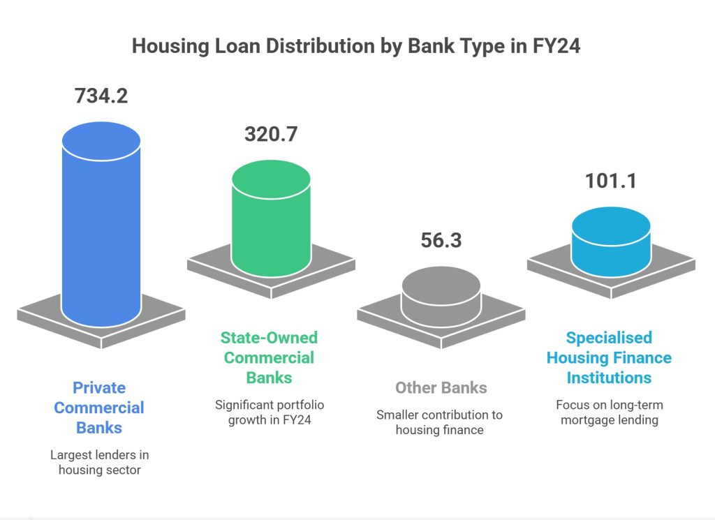 Private Commercial Banks remain the largest lenders in the housing sector, with outstanding loans rising to Tk 734.2 billion in FY24 from Tk 681.5 billion in FY23. Their vast deposit base and proactive loan disbursement strategies have cemented their lead in housing finance.