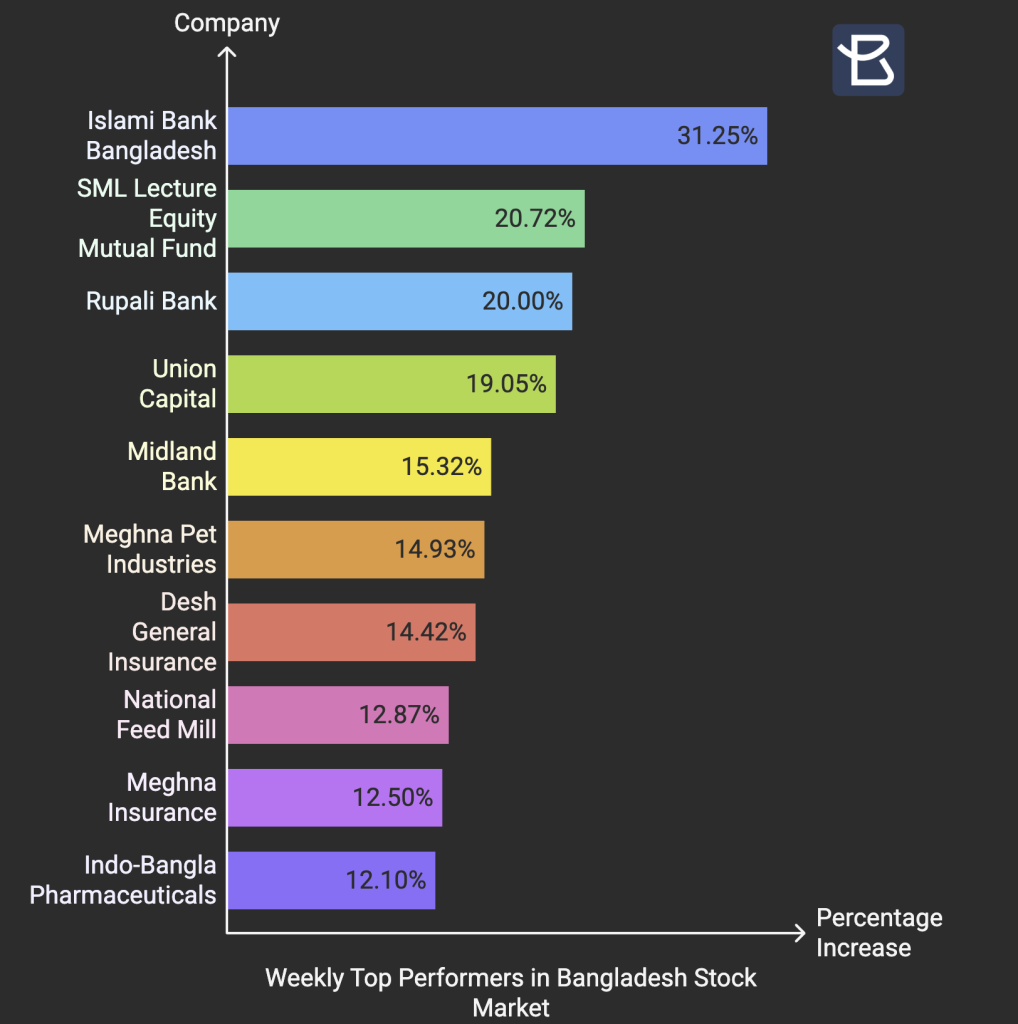 Islami Bank Bangladesh’s stock led last week’s Dhaka Stock Exchange rally, soaring 31.25% over five trading days and lifting its market value by Tk 1,690.49 crore. The share price climbed from Tk 33.60 to Tk 44.10 by Friday’s close, a gain of Tk 10.50 per share.