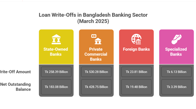 State-owned commercial banks accounted for a significant share, writing off Tk 258.39 billion in loans. Private commercial banks followed, reporting write-offs of Tk 530.28 billion. Foreign banks and specialized banks wrote off Tk 23.81 billion and Tk 6.13 billion respectively.